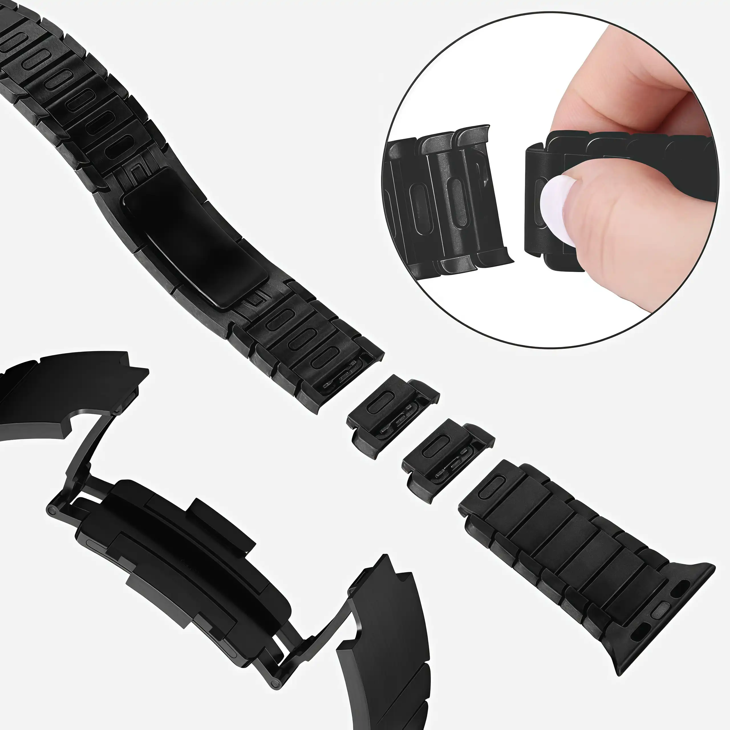 Звенья снимаются нажатием встроенных кнопок. Не нужно выдавливать штифты и пользоваться съёмником, как у обычных металлических блочных ремешков. Подогнать браслет под руку можно быстро и без лишних инструментов.